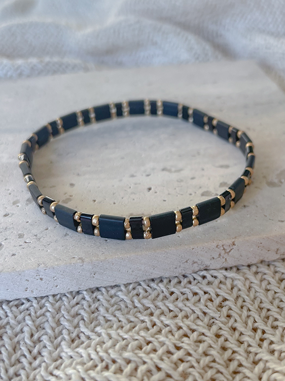 Pompeï is een zwarte armband met goudkleurige rocailles. Geïnspireerd op de archeologische attractie; robuust, klassiek, met rondingen die doen denken aan Romeinse zuilen.